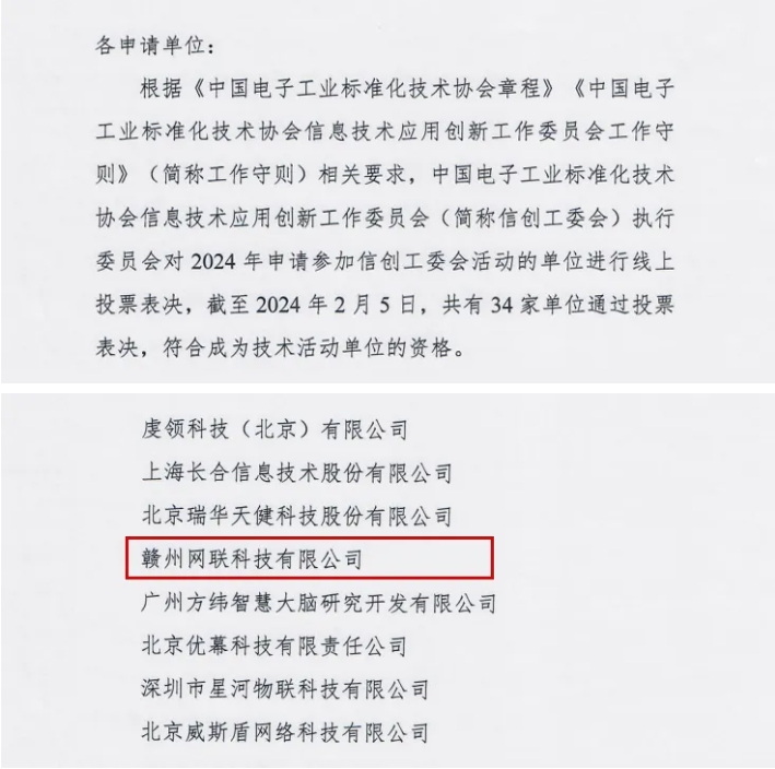 中國電子工業(yè)標(biāo)準(zhǔn)化技術(shù)協(xié)會信息技術(shù)應(yīng)用創(chuàng)新工作委員會(簡稱信創(chuàng)工委會)執(zhí)行委員會通過贛州網(wǎng)聯(lián)科技有限公司申請,正式成為信創(chuàng)工委會技術(shù)活動單位。